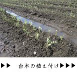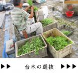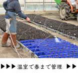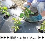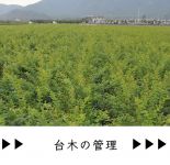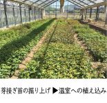 畑の台木は芽接ぎをした株もしなかった株も、11~12月にすべて畑から掘り上げます。一部は切り接ぎ用の台木になり、芽接ぎで活着した株は温室の中に植え込みます。いきなり屋外の圃場(畑)ではなく、一旦温室の中で管理するのは、接ぎ木をしたばかりの株は、屋外の環境に耐えられない弱い状態だからです。ある程度しっかりした株に生長したら、春に「新苗」として出荷する株と、冬に出荷する「大苗」の株に分けます。大苗用の株は温室での管理の後、3~6月上旬に大苗用に作られた屋外の圃場に植え込みます。このように台木づくりの段階から出荷まで、生長に合わせて掘り上げと植え込みを何度も繰り返すのです。