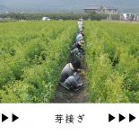 圃場へ定植した大苗用の株を、病害虫が心配になる梅雨時の6月から10月頃まで、消毒やピンチ(摘芯)、草取りなどを行いながら管理します。花を咲かせることなく、芽が出たらすぐに摘み取るピンチは、丈夫な根を育てるためには欠かせない作業。炎天下の中、株1本1本をピンチして行くのですが、圃場の広さは5ヘクタール以上。ようやく一巡する頃には、最初の株の芽が出てきてしまい、まるでイタチごっこのような作業です。